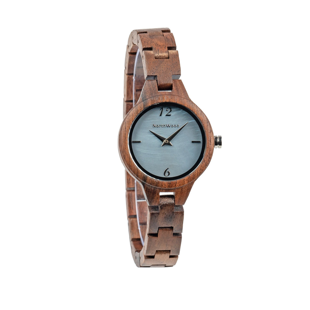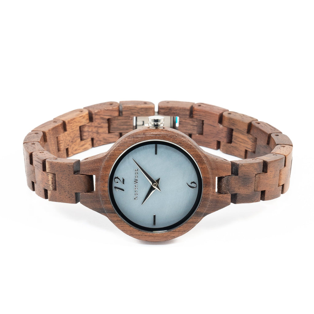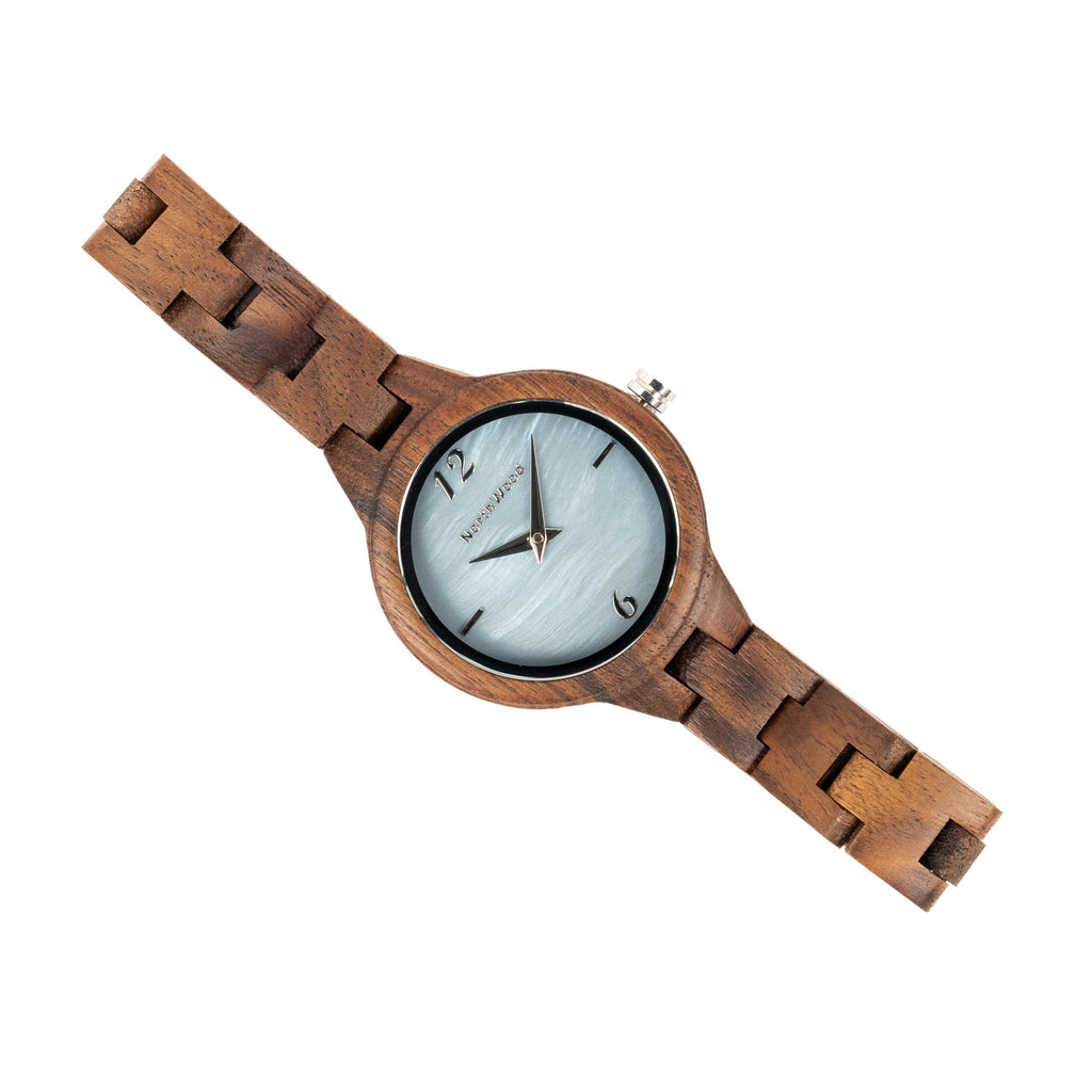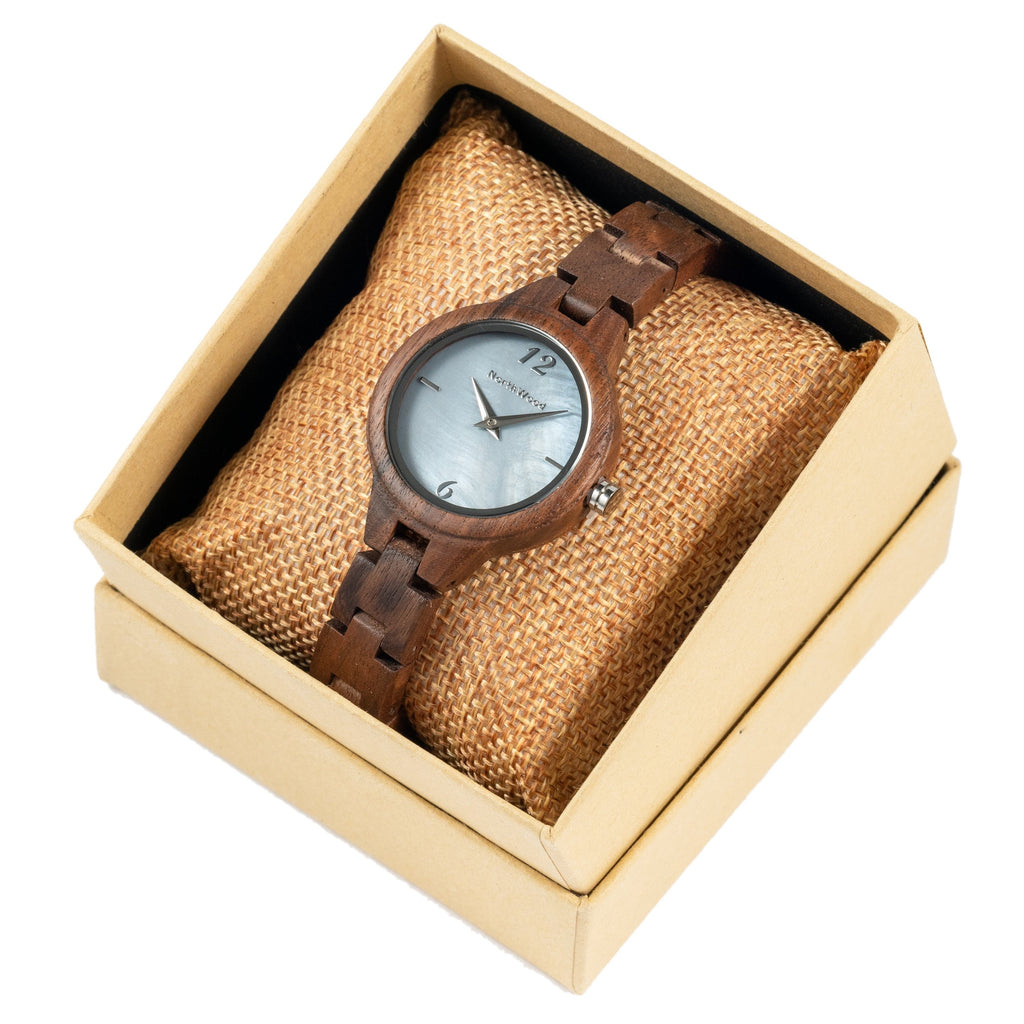 Embrace the unparalleled elegance of our hand-crafted Natural Walnut Wood timepiece, meticulously designed to exhibit the sleek slenderness of this distinguished material. The watch features a lustrous Mother of Pearl dial that emanates an entrancing iridescence, making it an ideal choice for those who appreciate a blend of sophistication and charm in their accessories.